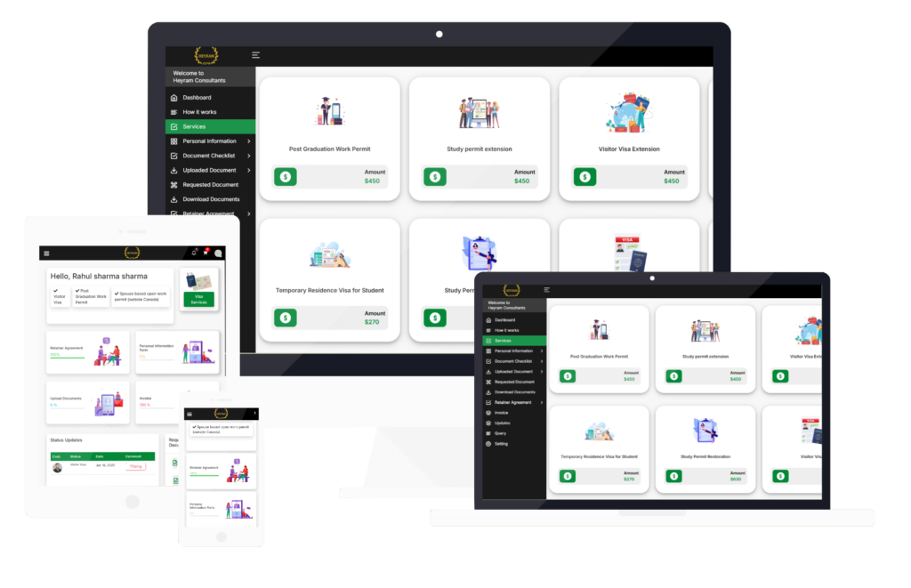 At Heyram Consulting, we believe in innovation and efficiency. That’s why we’ve developed our very own CRM to revolutionize the way we serve you. This state-of-the-art platform ensures seamless communication and personalized support at every step of your immigration journey. Join us and enjoy the perfect blend of technology and expertise!